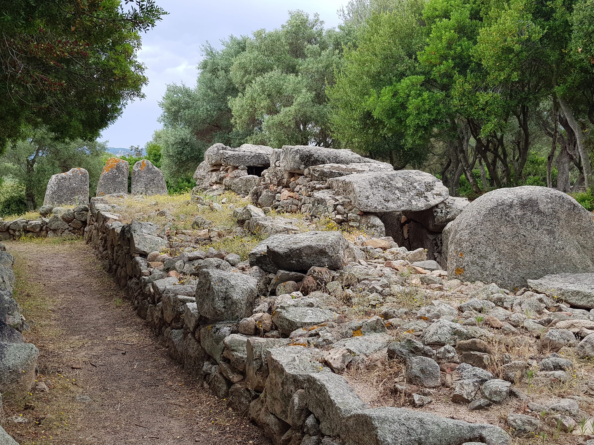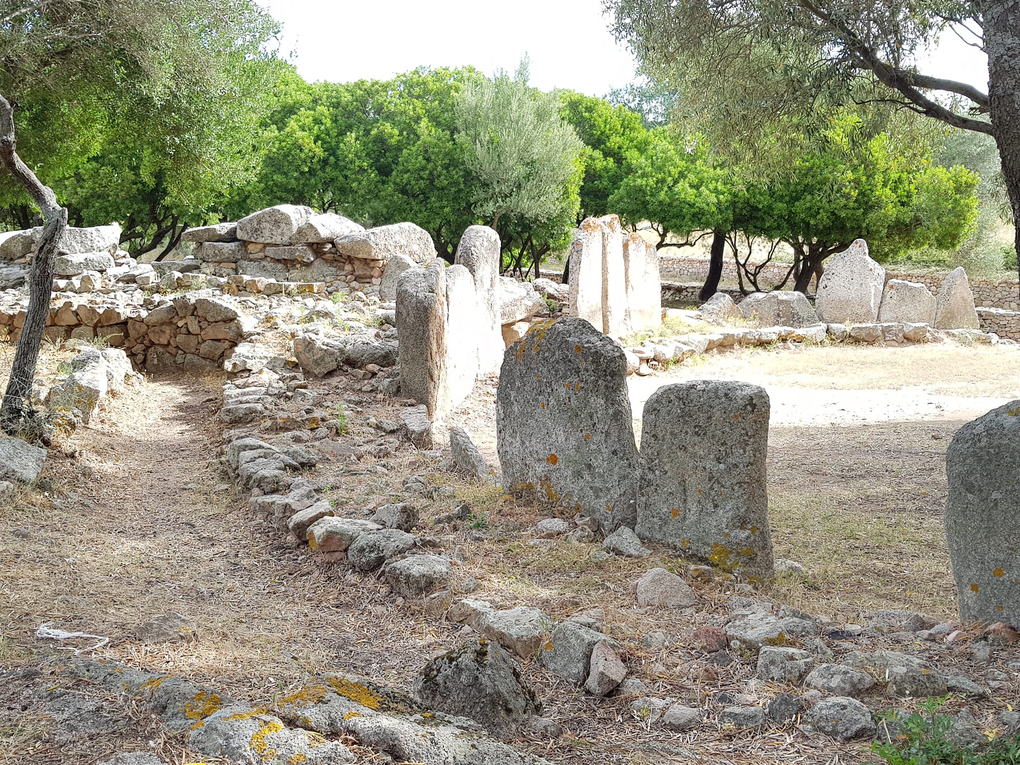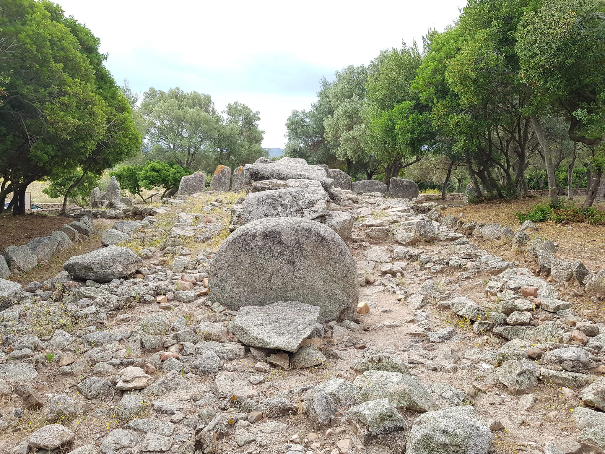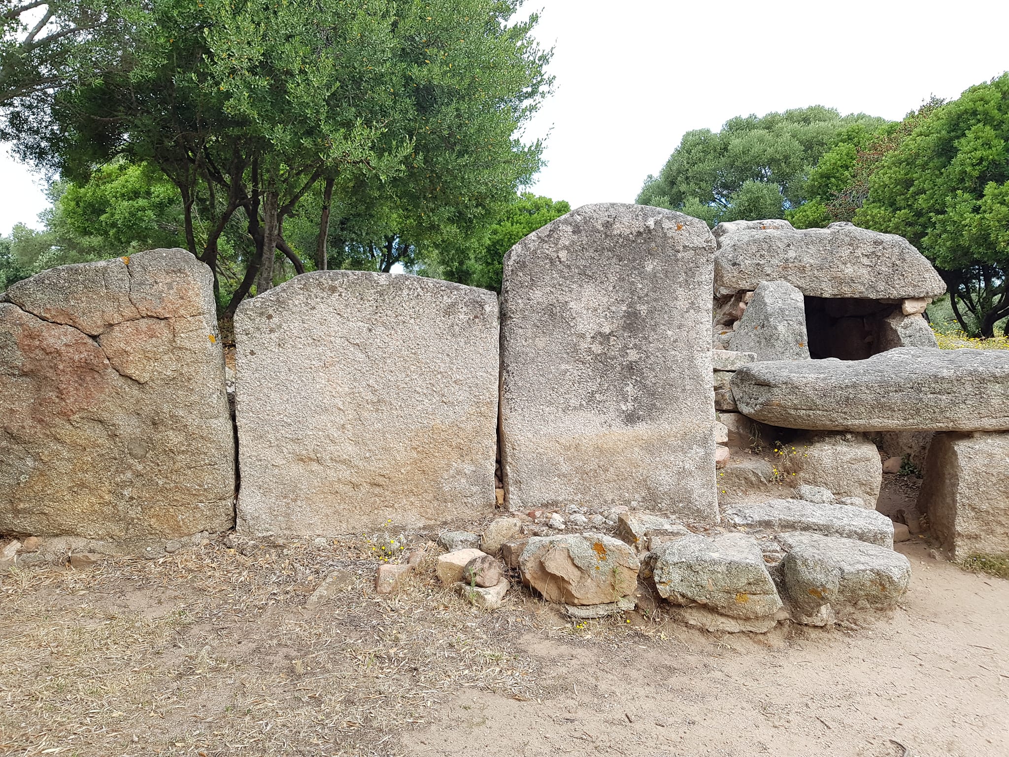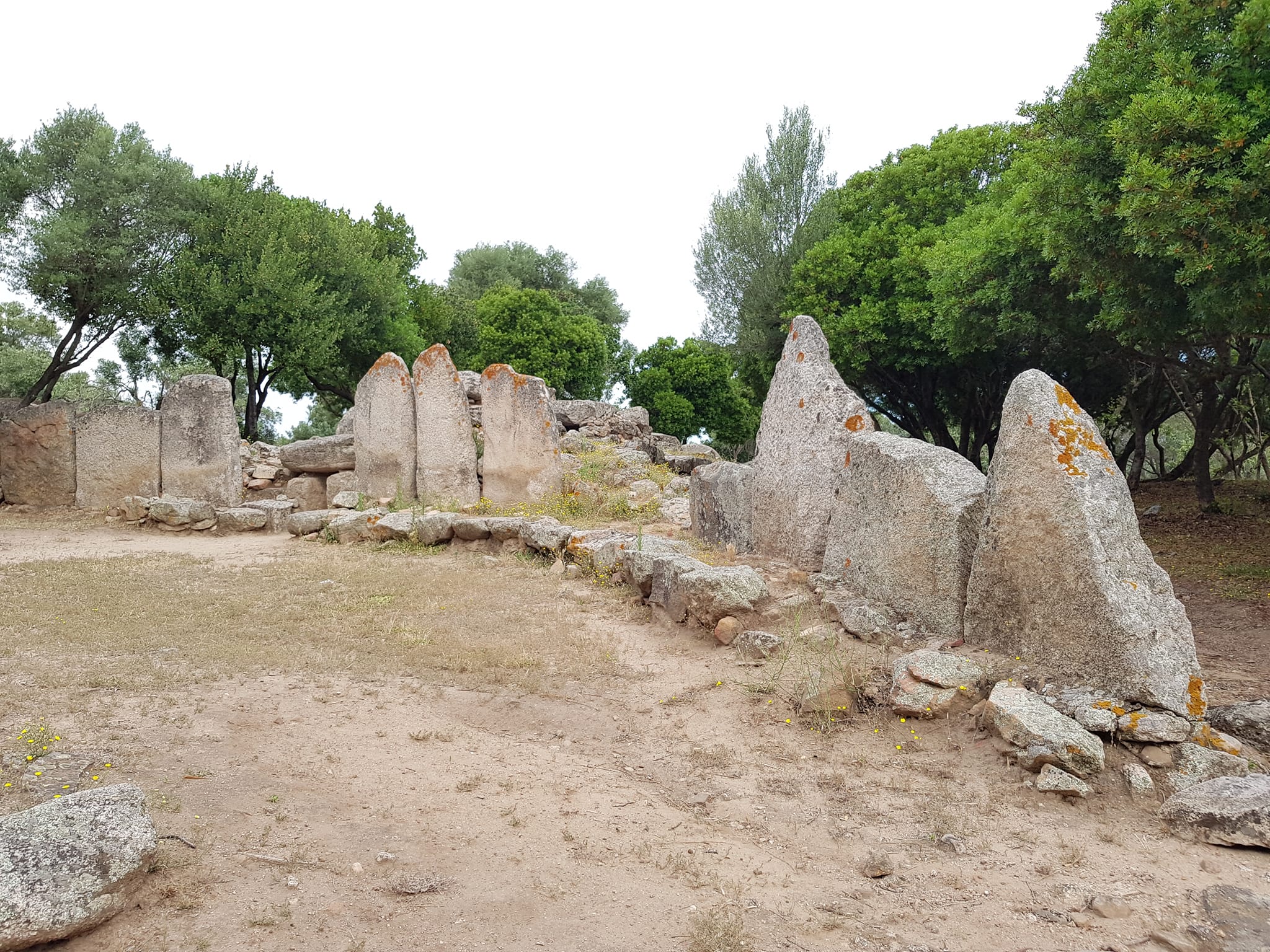 La costruzione fu edificata in due fasi. Nella prima, risalente al periodo della cultura di Bonnanaro, venne costruita la tomba ad allée couverte – una sorta di dolmen allungato -, successivamente, attorno al 1600 a.C., fu trasformata in tomba di Giganti con esedra e stele, delle quali potrai ammirare alcune tracce.