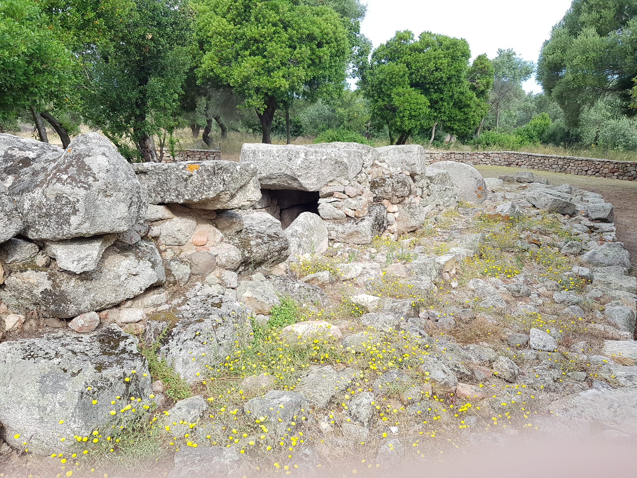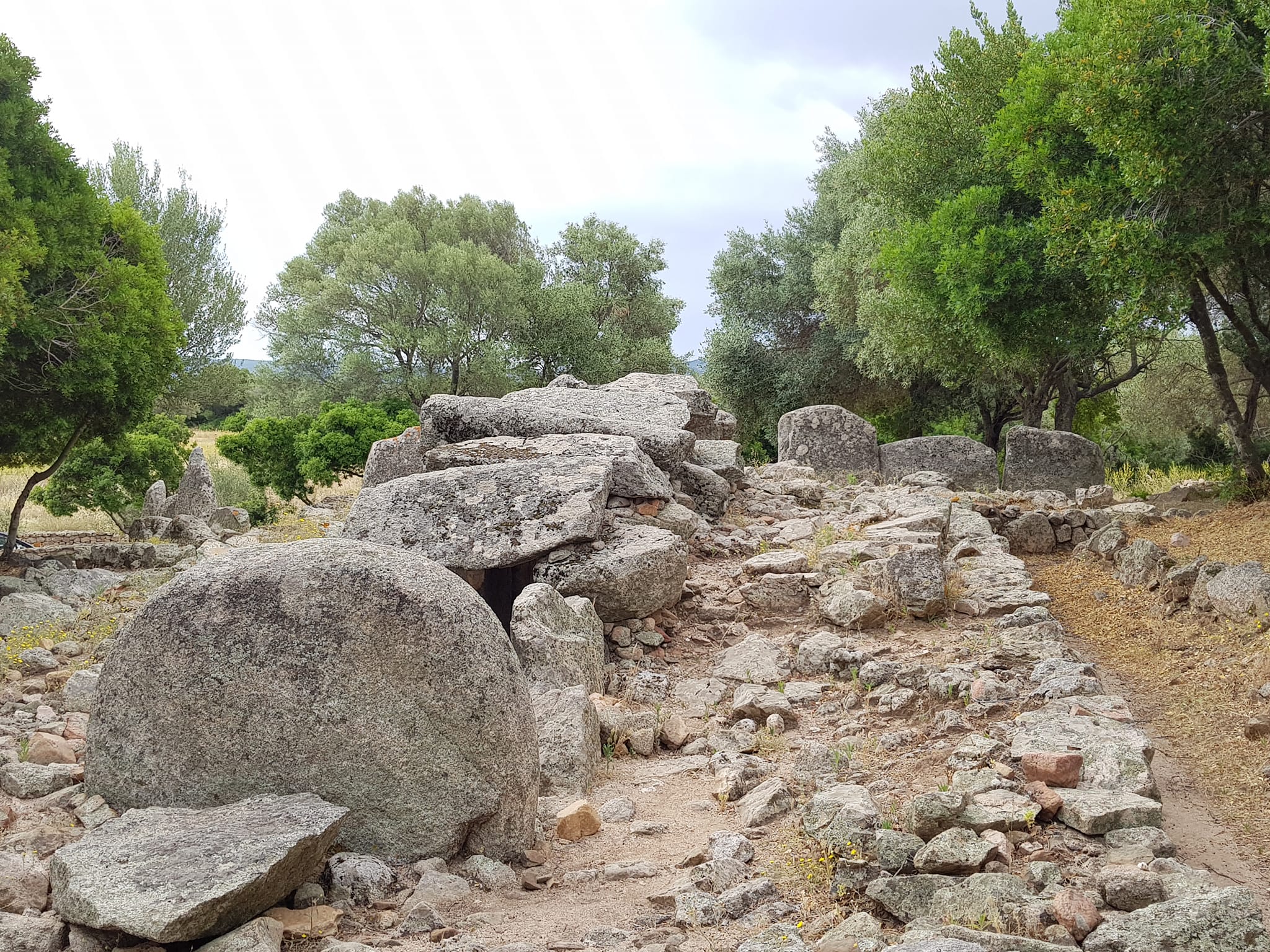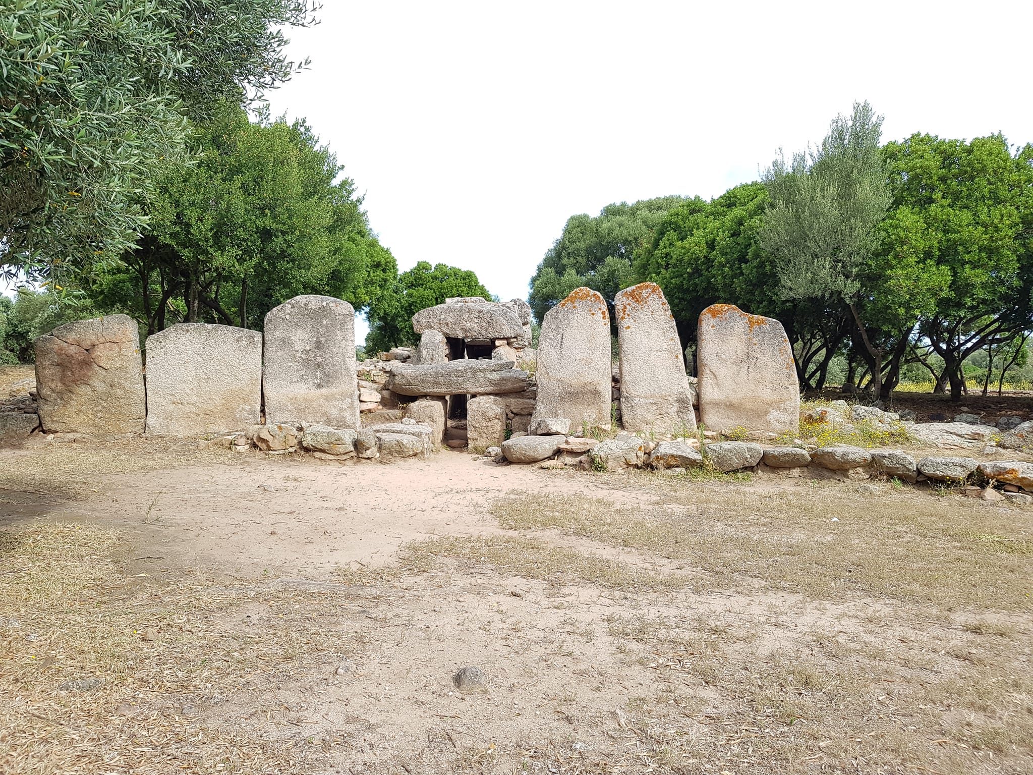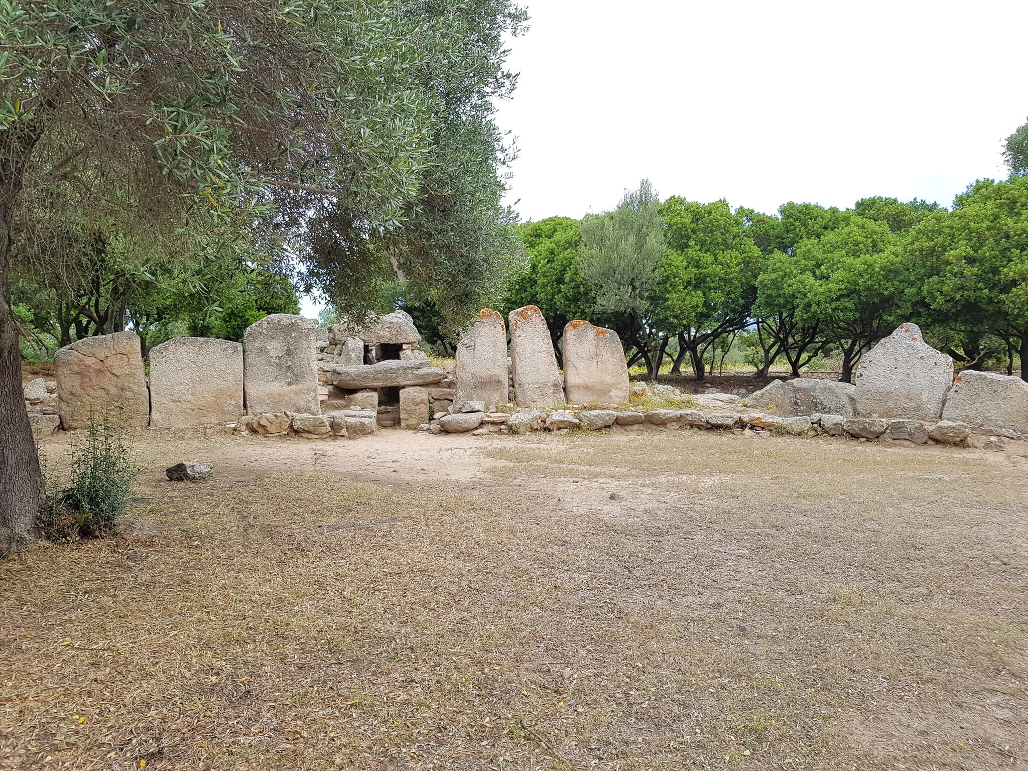 La costruzione fu edificata in due fasi. Nella prima, risalente al periodo della cultura di Bonnanaro, venne costruita la tomba ad allée couverte – una sorta di dolmen allungato -, successivamente, attorno al 1600 a.C., fu trasformata in tomba di Giganti con esedra e stele, delle quali potrai ammirare alcune tracce.