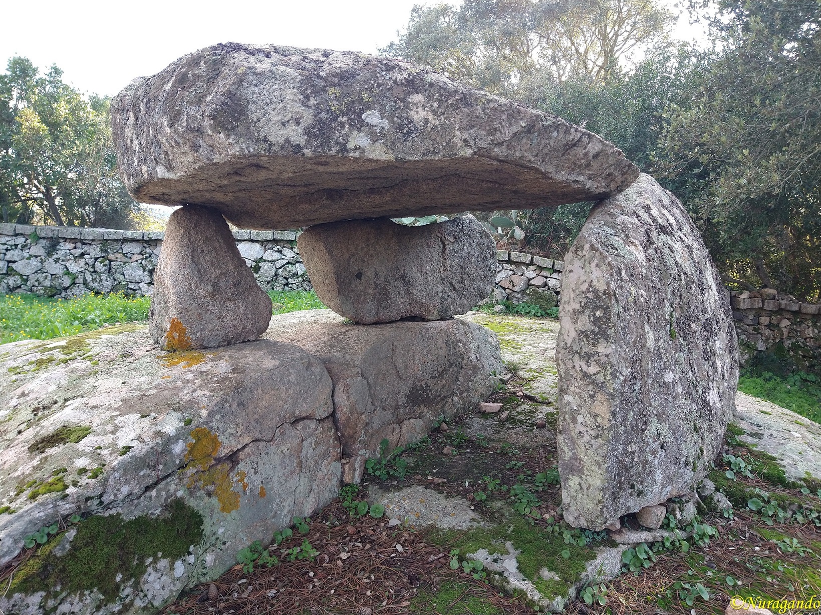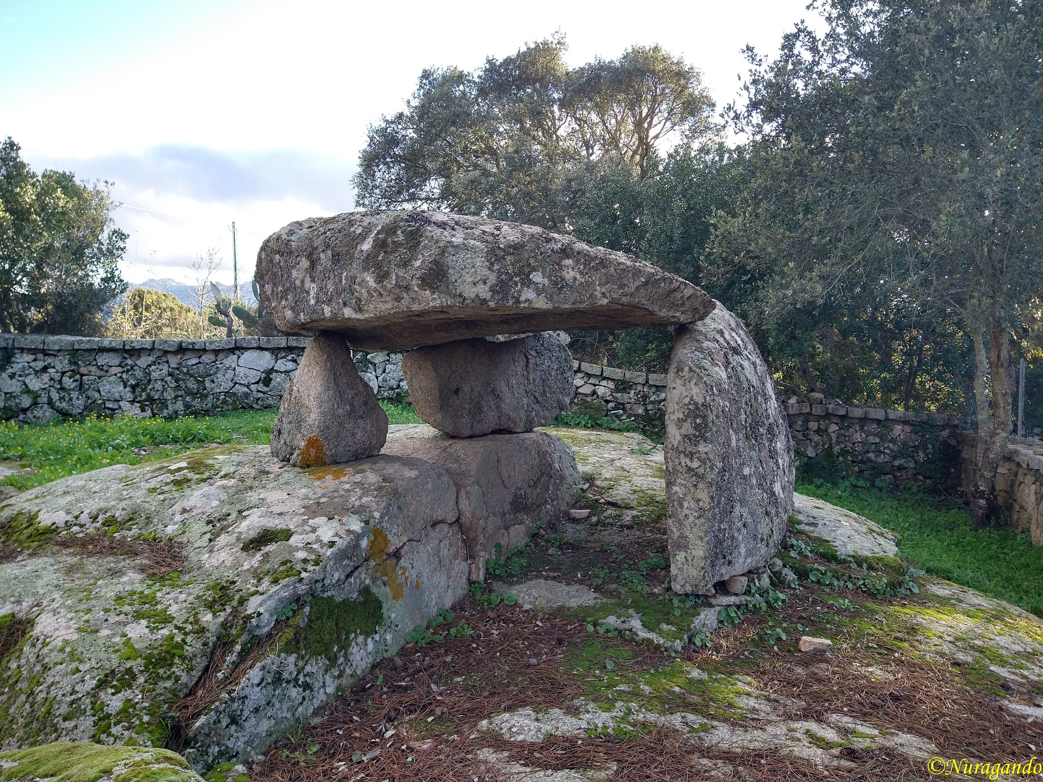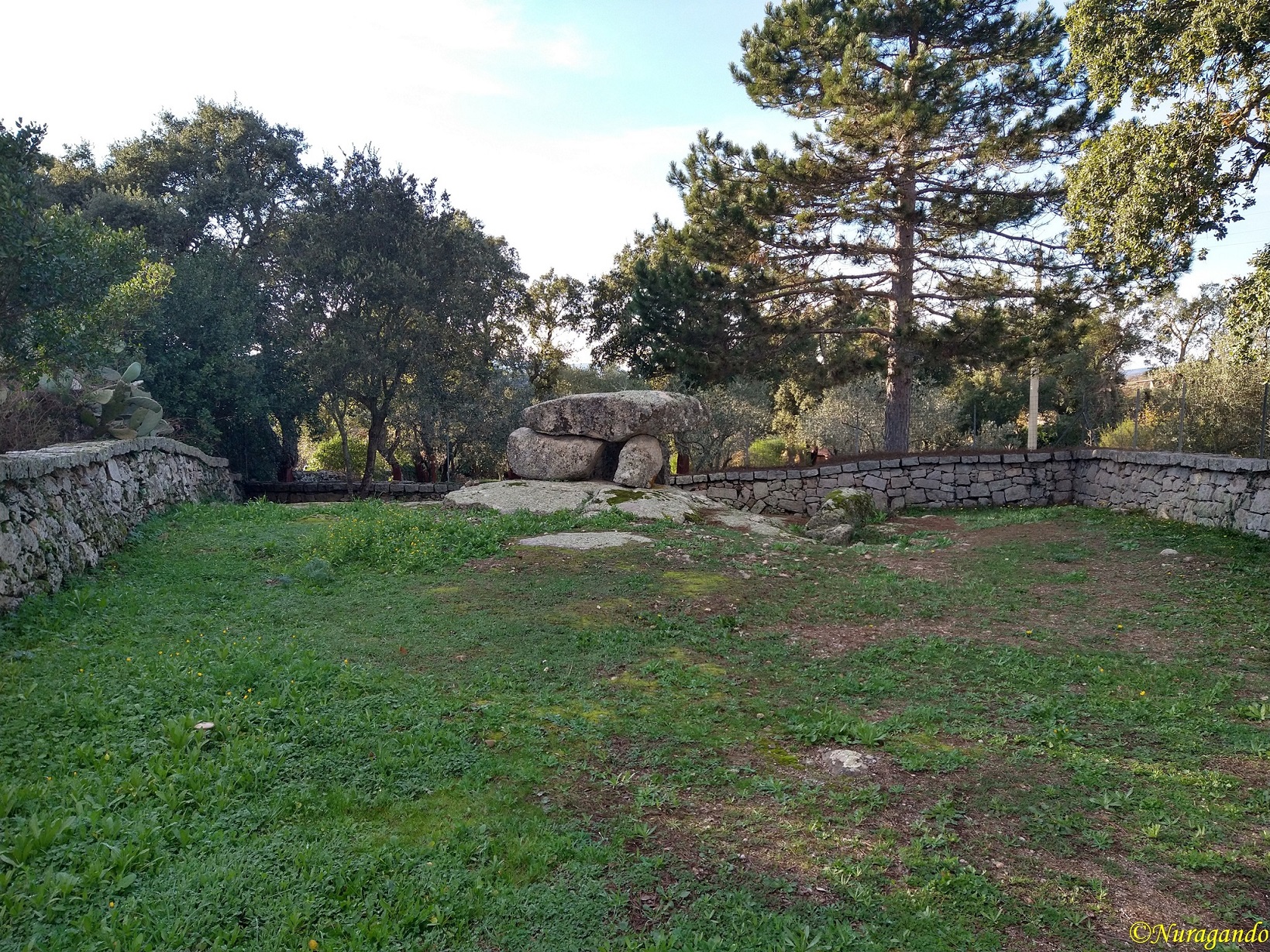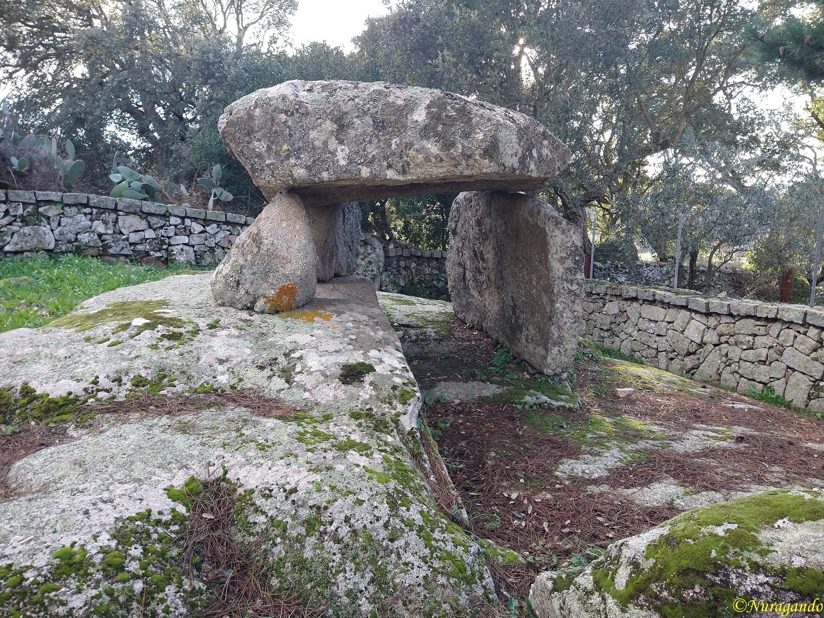 Dolmen semplice, con pianta rettangolare e ingresso rivolto a Nord-Est. La parete di destra è costituita da un lastrone rettangolare, quella di sinistra da due massi semilavorati, poggianti su roccia naturale. Il lastrone di copertura è appiattito nella superficie inferiore e lasciato al naturale in quella superiore. EPOCA: Civiltà di Ozieri (3500-2700 a. C.)