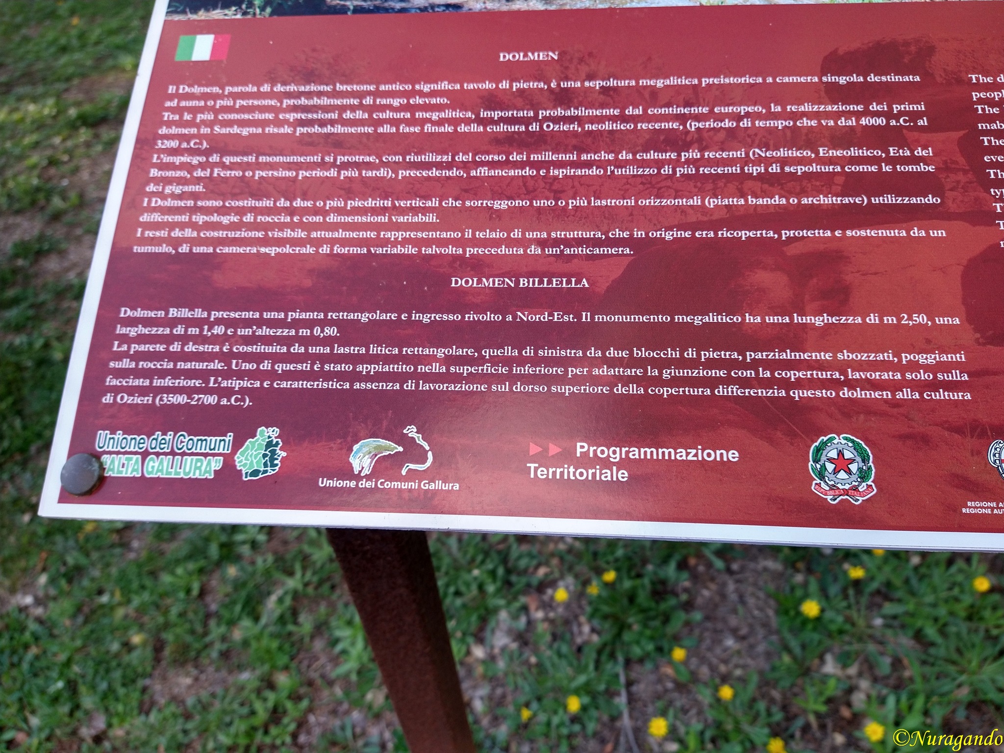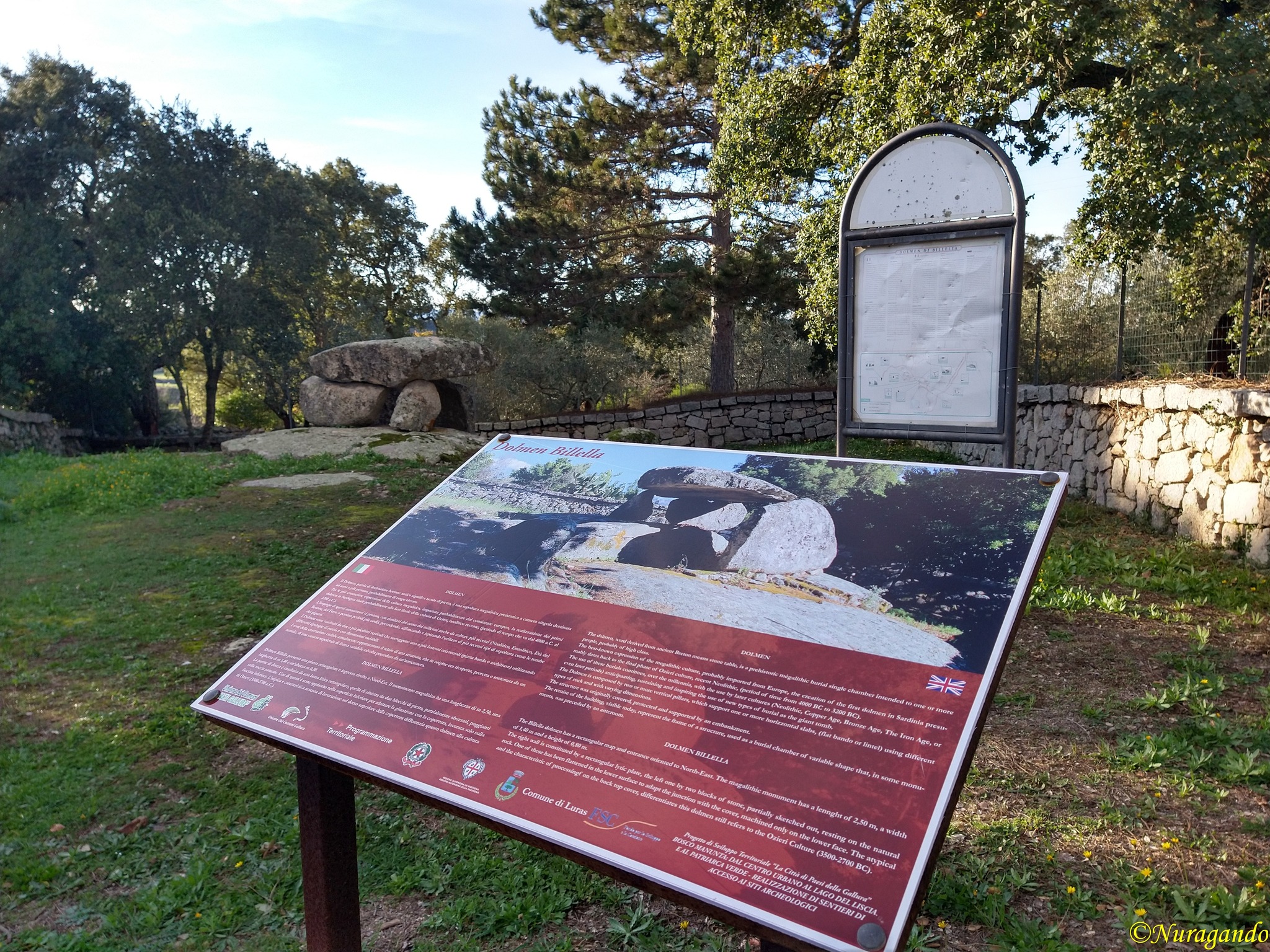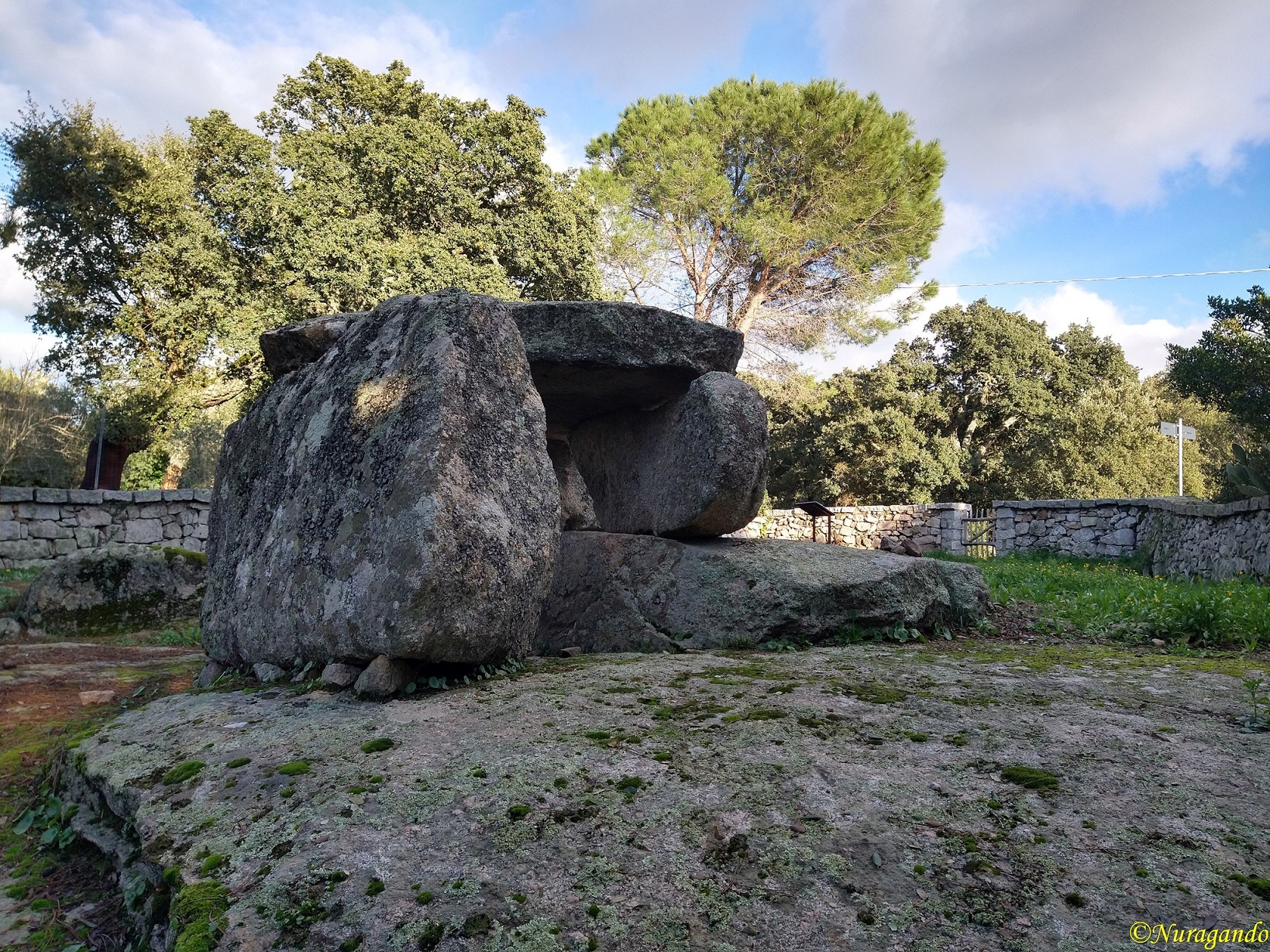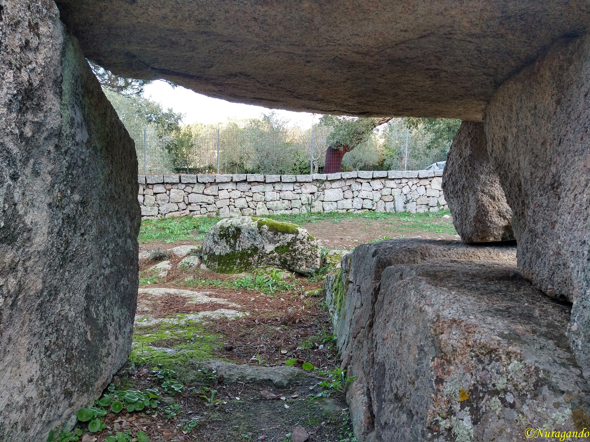Dolmen semplice, con pianta rettangolare e ingresso rivolto a Nord-Est. La parete di destra è costituita da un lastrone rettangolare, quella di sinistra da due massi semilavorati, poggianti su roccia naturale. Il lastrone di copertura è appiattito nella superficie inferiore e lasciato al naturale in quella superiore. EPOCA: Civiltà di Ozieri (3500-2700 a. C.)