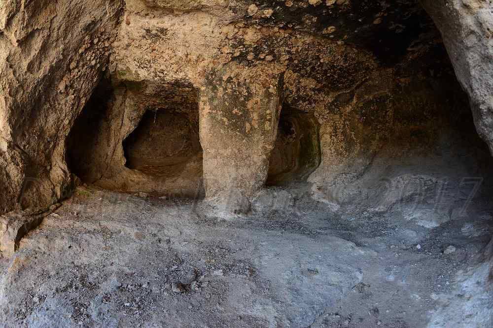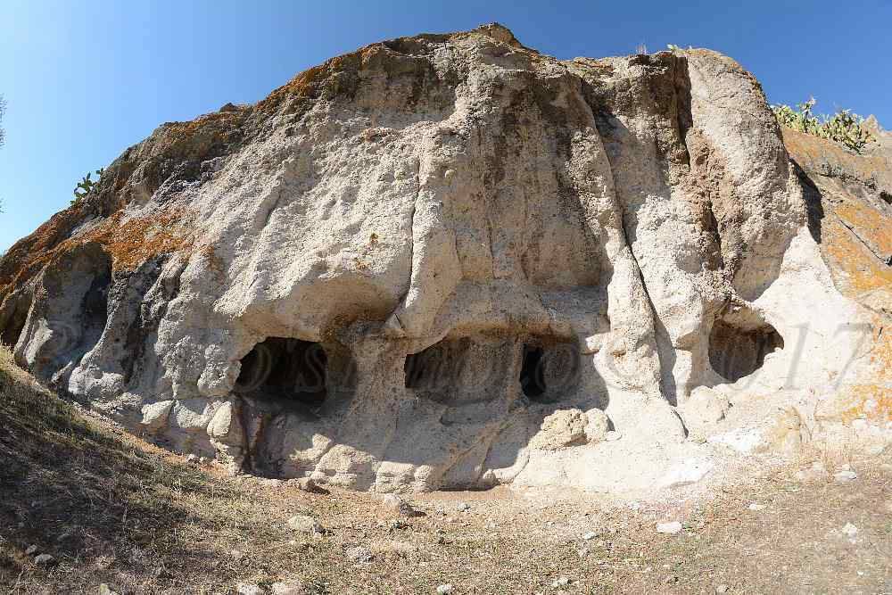 Allineate su di un’alta parete rocciosa, le otto tombe non hanno particolari bellezze architettoniche, anzi sono d’una semplicità unica tanto da far pensare che non fossero delle vere e proprie tombe ma “forse”dei rifugi adattati per essere usati come riparo per le popolazioni del Neolitico. Baciate dal sole, grazie alla loro esposizione ad est, ci appaiono come delle piccole e modeste cavità, ingentilite dalla loro foggia d’ingresso, ora quadrangolare, ora ovoidale. All’interno tutte si presentano molto sobrie, con più celle. Solo in una vi è un accenno di incisione di un motivo probabilmente corniforme. (Pieragica)