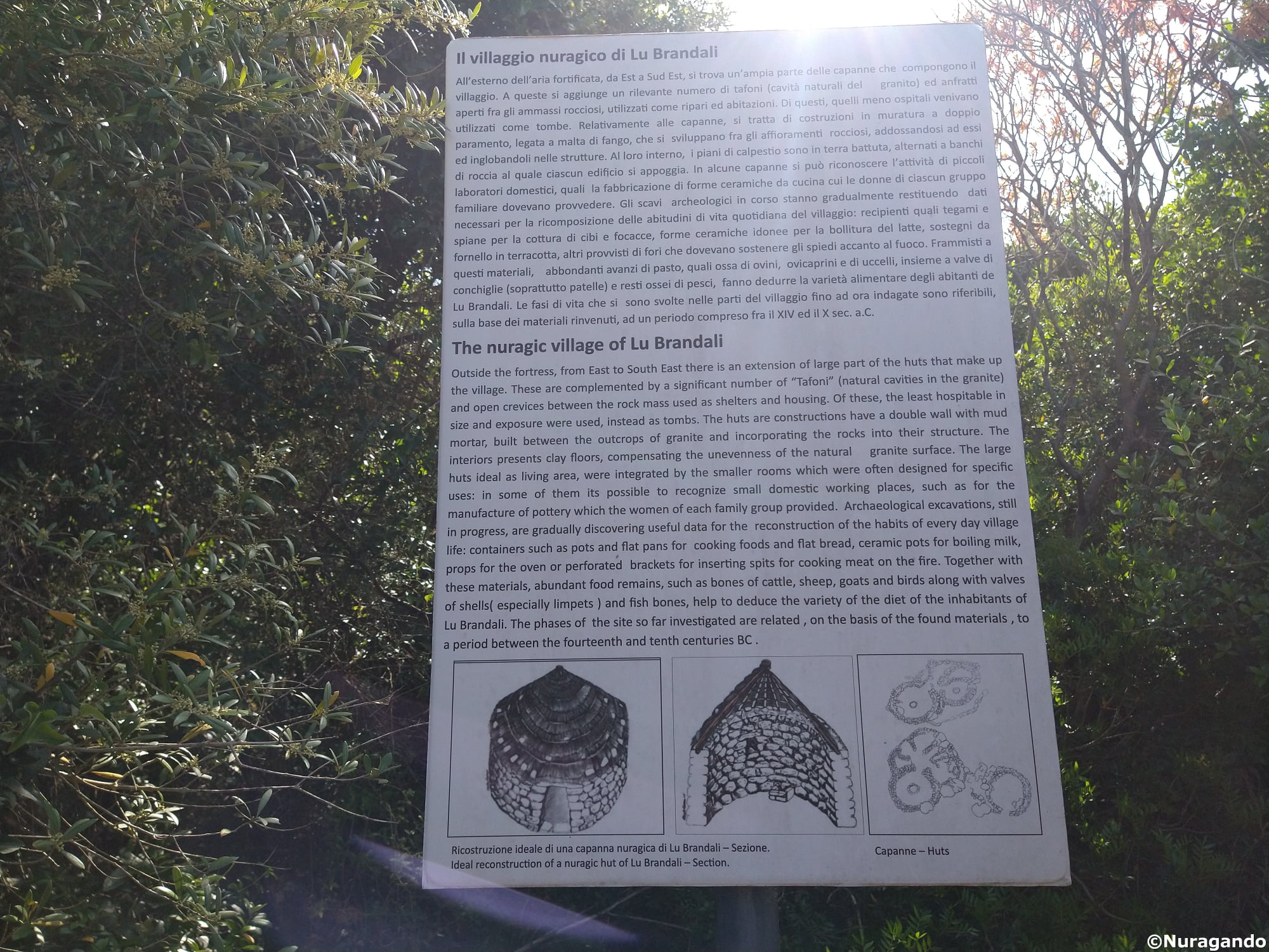 Il nuraghe di Lu Brandali è di tipo misto, con caratteristiche sia del nuraghe a corridoio che di quelli a tholos. L”ingresso si apre nella porzione nord-ovest di quest”ultimo, scandito nella sua lunghezza da varie torri d”avvistamento che sfruttano degli affioramenti di roccia. All”esterno della cortina muraria si sviluppa il villaggio, i rilevamenti di Michele Careddu nel 1967 censivano 36 capanne per lo più a forma circolare. Periodo compreso tra il XIV e il X secolo a.C..