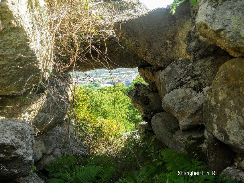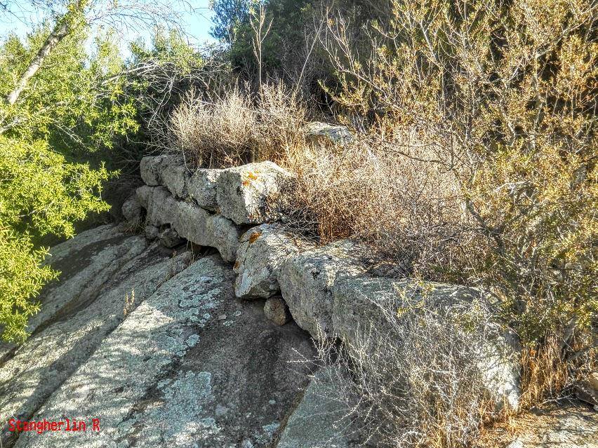 La cinta dispone di un unico ingresso, alla destra un cunicolo sovrastato da lastre di copertura, che parrebbe assomigliare ad una tomba dei giganti, fatto abbastanza raro nell’età nuragica, quando i sepolcri erano sempre edificati nelle vicinanze dei nuraghi ma mai al loro interno.