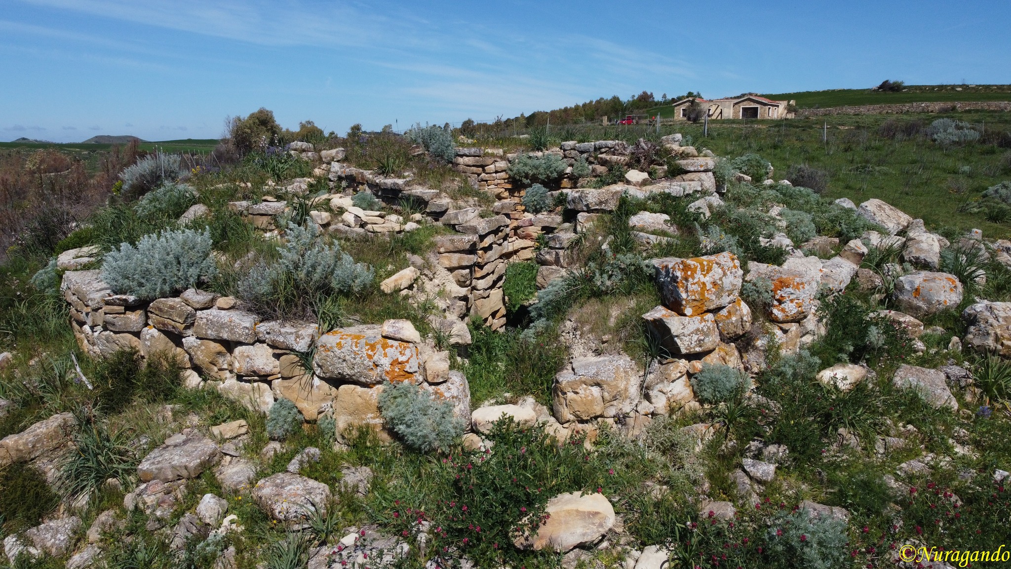 Intorno al nuraghe, oltre a resti delle capanne circolari del villaggio nuragico, vi sono cospicui resti di vani di forma rettangolare, forse pertinenti al riutilizzo di età punica e romana, riuso confermato anche dai ritrovamenti di ceramiche puniche ed attiche a vernice nera ascrivibili al V e IV secolo a. C. e di resti di embrici e stoviglie varie tra cui frammenti di ceramica pseudo aretina.