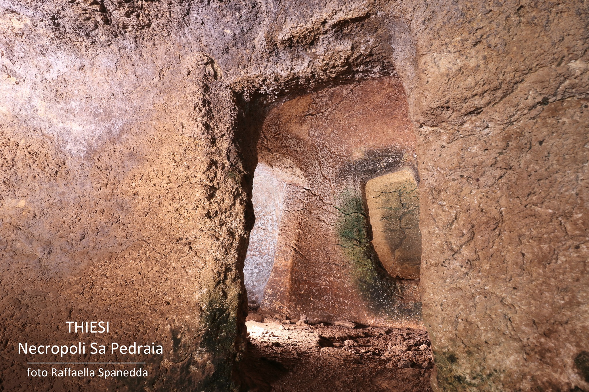 La necropoli “Sa Pedraia” è composta da cinque ipogei disposti ravvicinati su una breve parete rocciosa. Una di esse ha l’anticella con tetto spiovente e solcature indicanti l’andamento dei travi. Nello stesso ambiente, sono state scolpite in modo naturalistico due Protomi Taurine (teste di toro) ad indicare che il dio della fecondità avrebbe garantito la rinascita nella nuova vita. La Domus adiacente sulla sinistra ha una cella provvista di pilastro centrale e di piano sopraelevato di decubito.