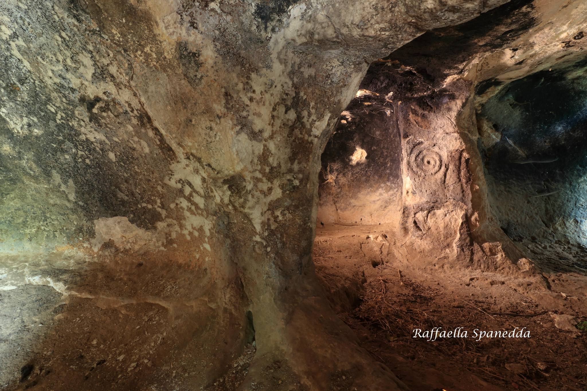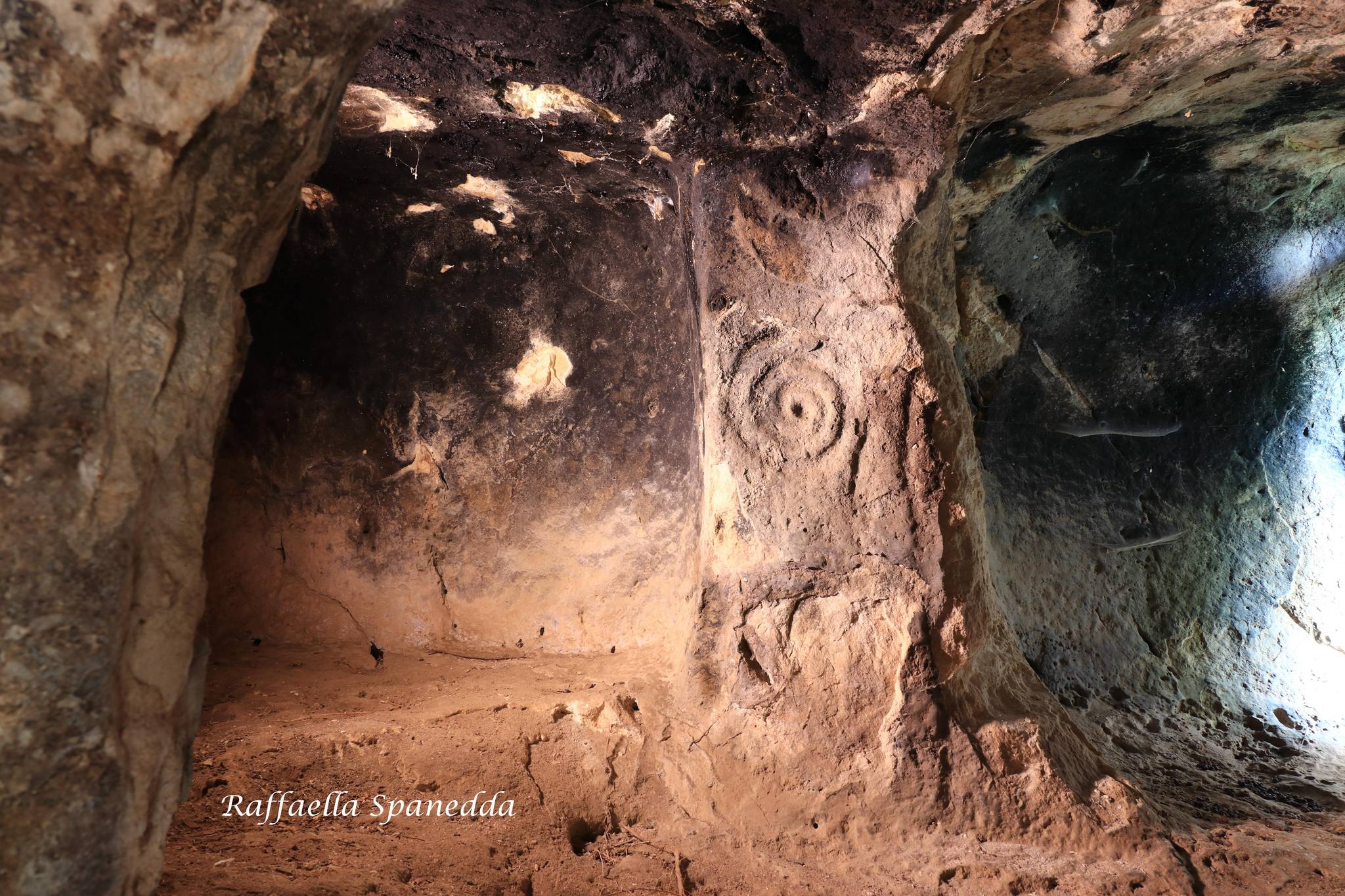 Le pareti risultano annerite,ma nonostante le concrezioni,su un pilastro è visibile una bellissima spirale,unico simbolo magico-rituale dell’ipogeo.