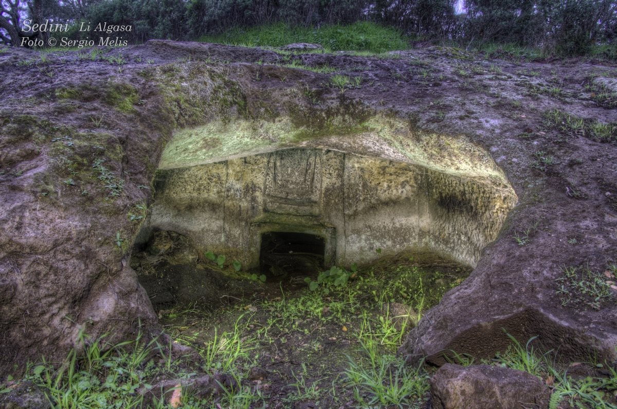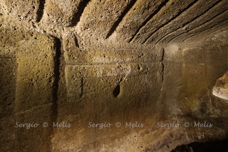 Scavata in una bassa formazione trachitica, presenta una protome taurina nell’anticella. (Wikipedia)