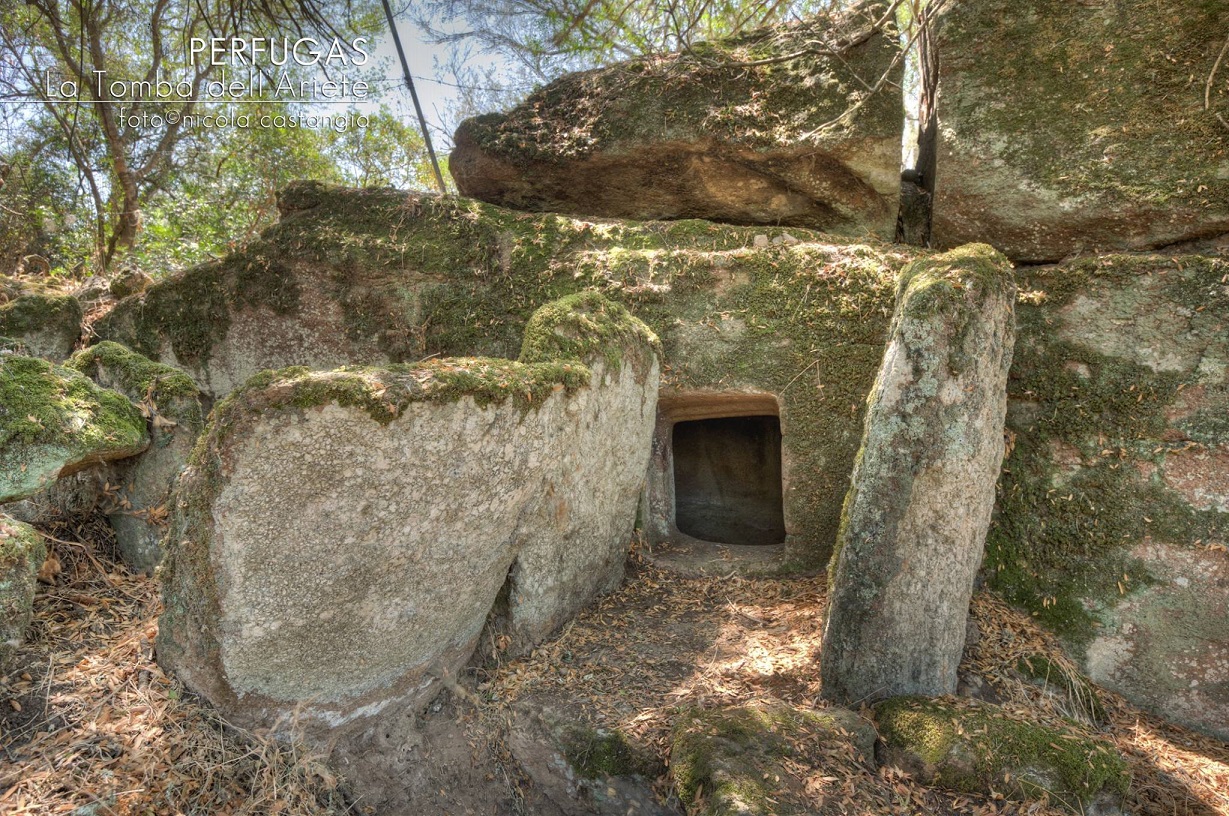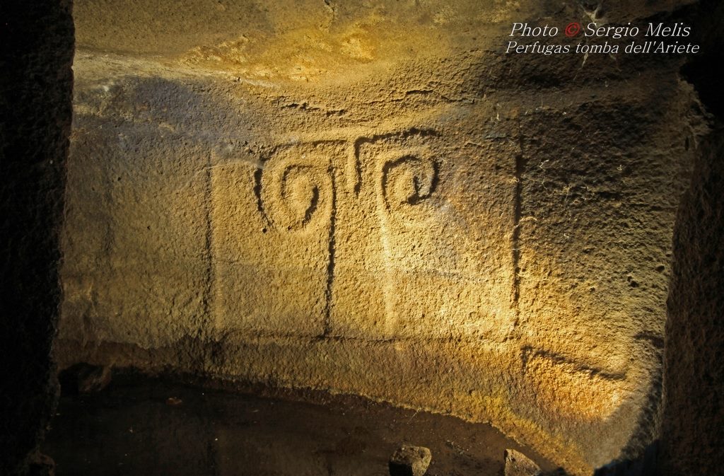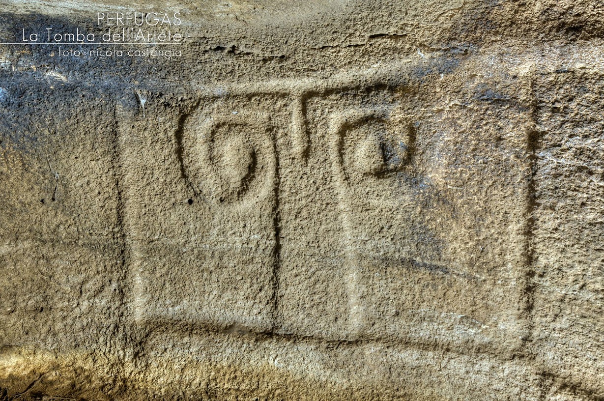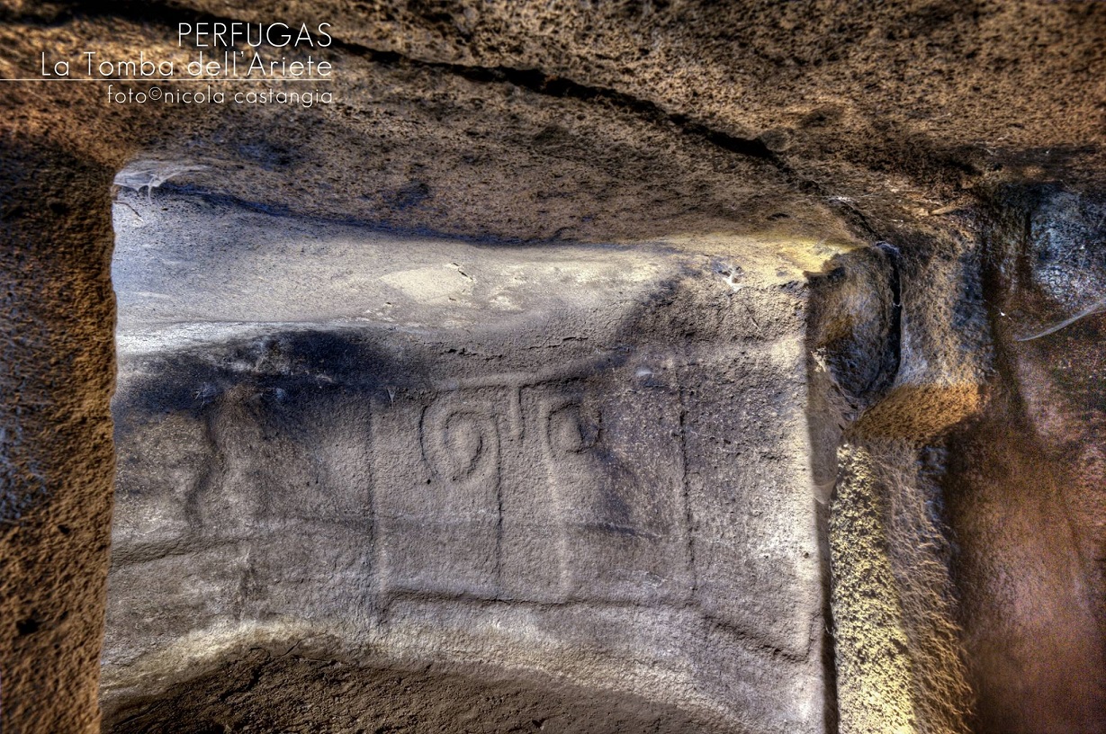 Questa domus de janas prende il nome dalla scultura in bassorilievo di quella che generalmente viene identificata con una protome d’ariete scolpita su una delle pareti interni. L’altra specificità consiste nel corridoio dolmenico presente davanti all’imboccatura.