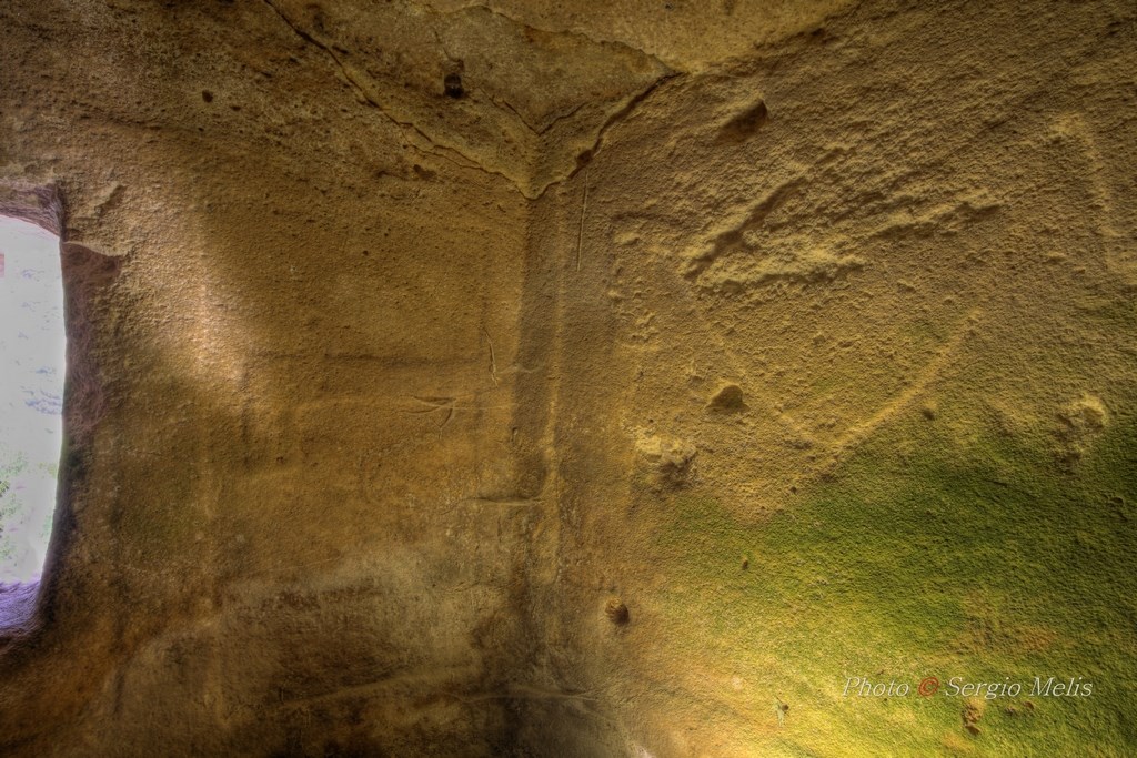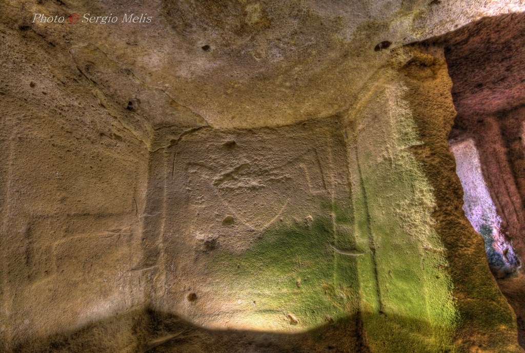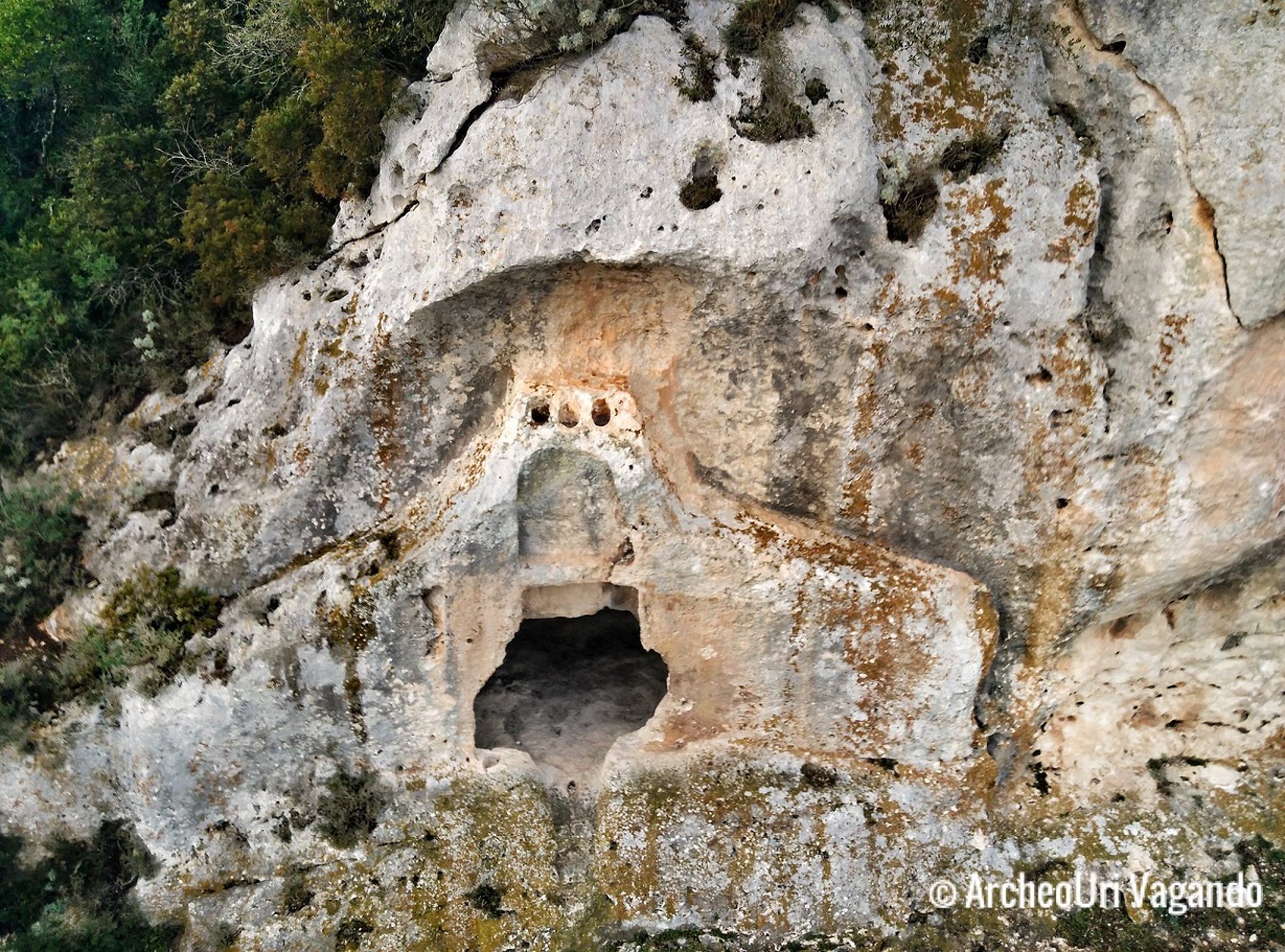 Sette tombe riproducono le abitazioni prenuragiche: tetti a singola o doppia falda, orizzontale o spiovente, con o senza travi centrali e travetti laterali, sorretti o meno da pilastri, tutti scolpiti nella roccia. Una ha prospetto architettonico con la stele centinata scolpita