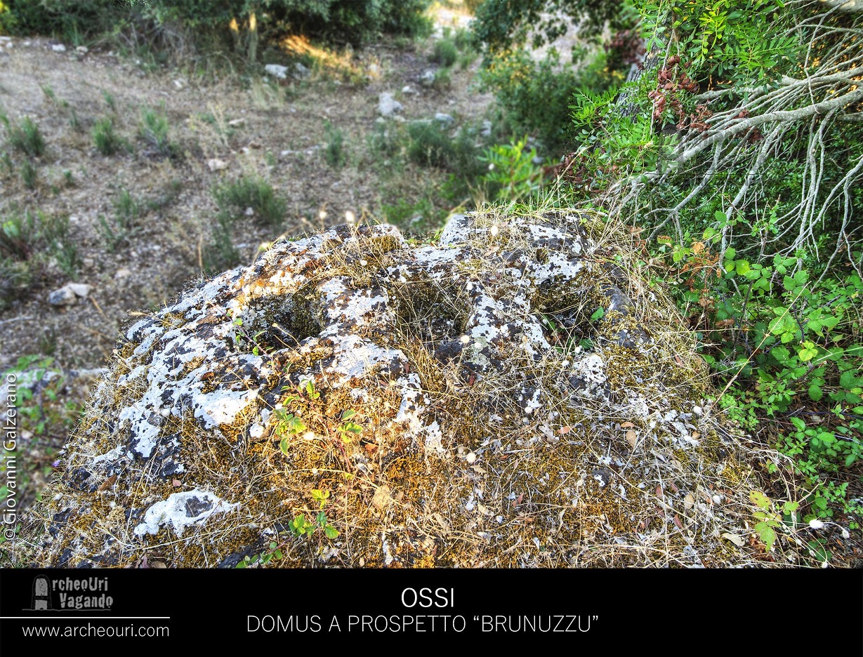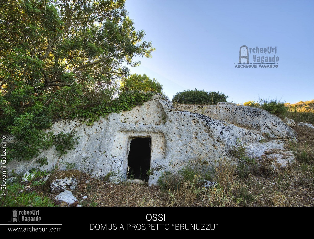 Le tombe a prospetto, come questa, di Brunuzzu, presentano sul fronte un motivo scolpito che richiama quello della stele centrale delle tombe di giganti. La tomba qui raffigurata presenta in particolare, sulla sommità, tre incavi nei quali presumibilmente erano infissi altrettanti piccoli betili.