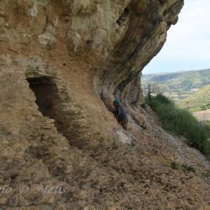 Gli ambienti si affacciano su uno stretto terrapieno contenuto da un muretto a secco moderno, la parete di roccia presenta, ai lati dell’ingresso dal vano centrale, due strette gradinate scavate nella parete rocciosa, attraverso le quali è possibile raggiungere il pianoro soprastante.