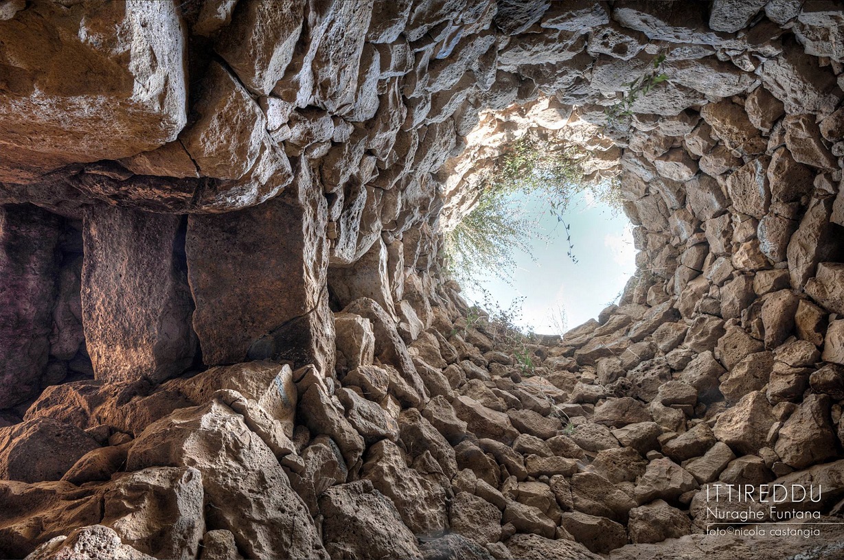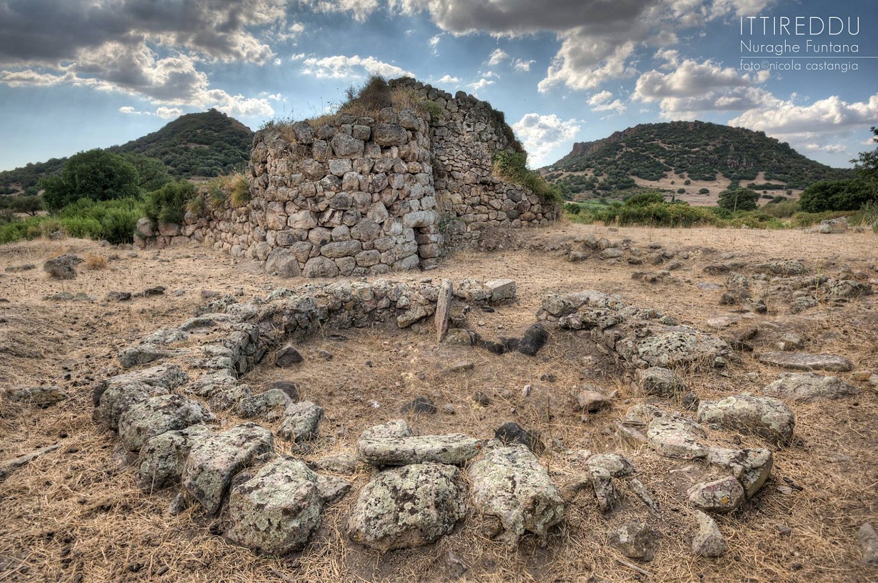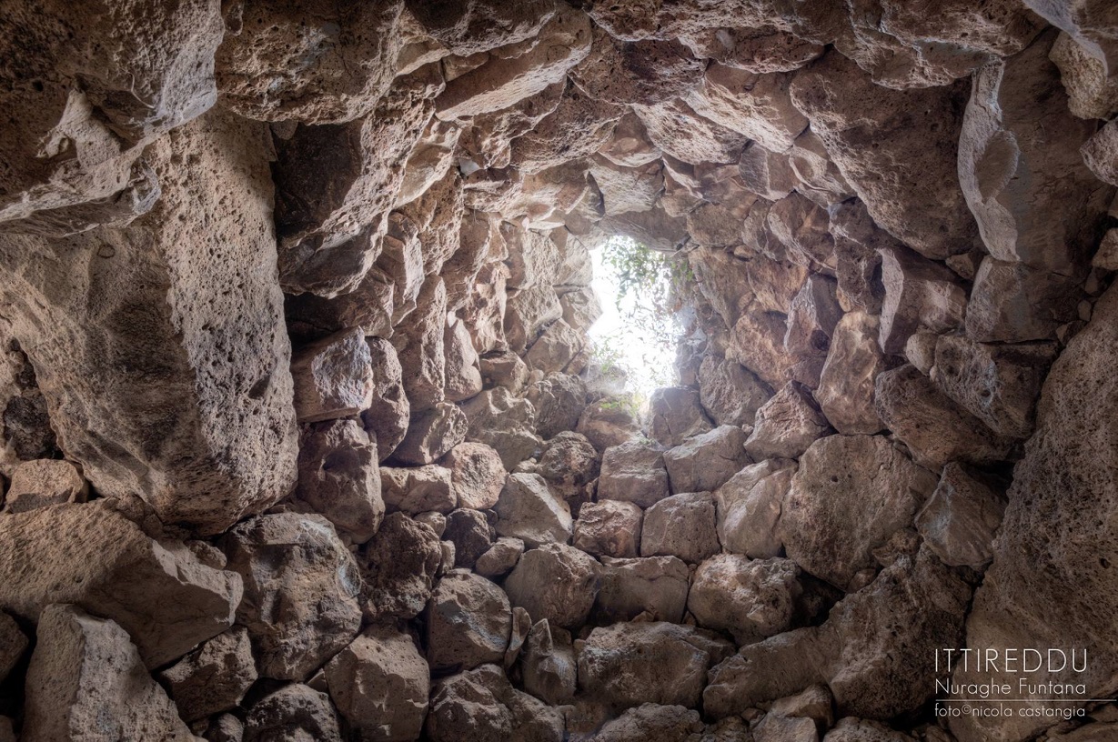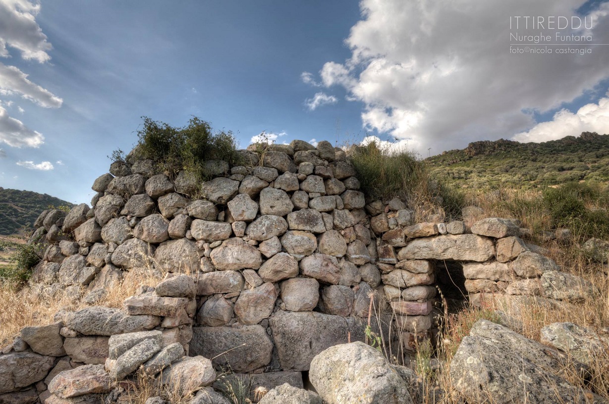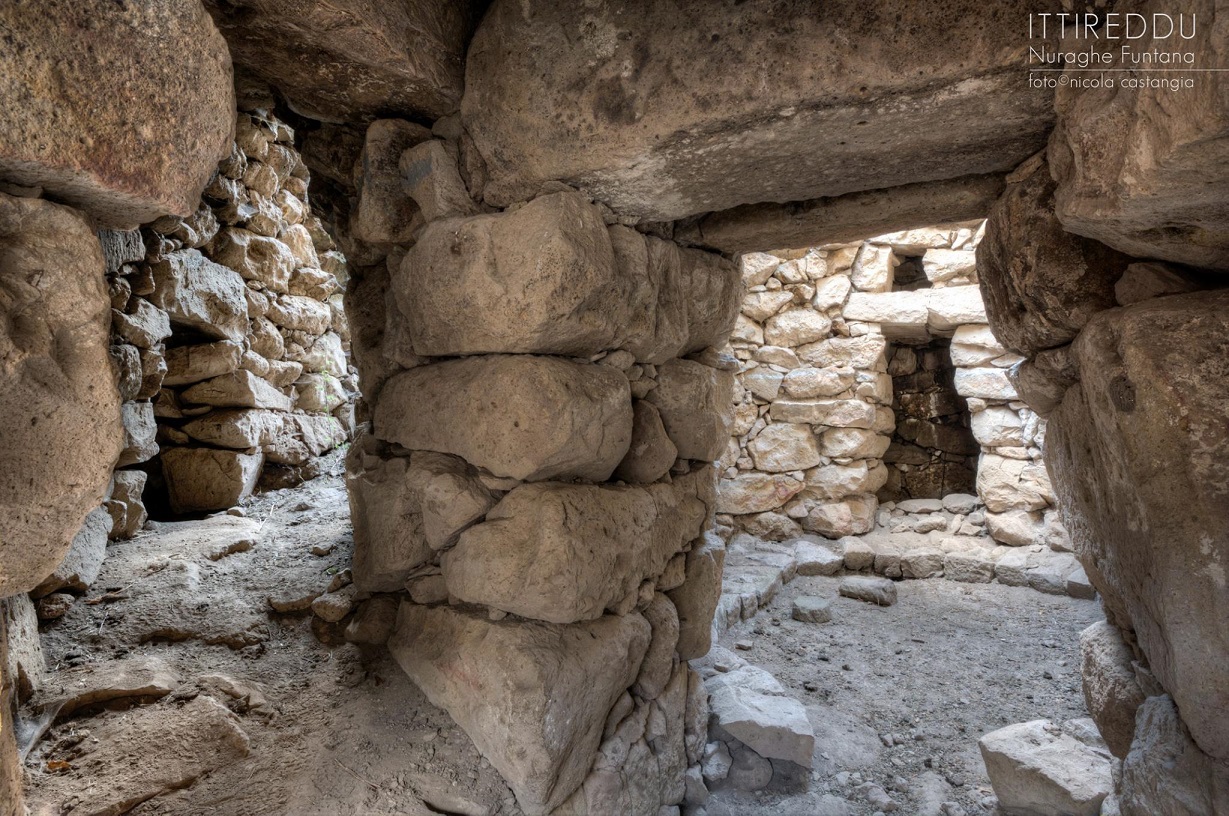 La torre principale (diam. m 18,00) presenta l”ingresso orientato a SE (largh. m 0,80-1,20) sormontato da un architrave con finestrino di scarico.