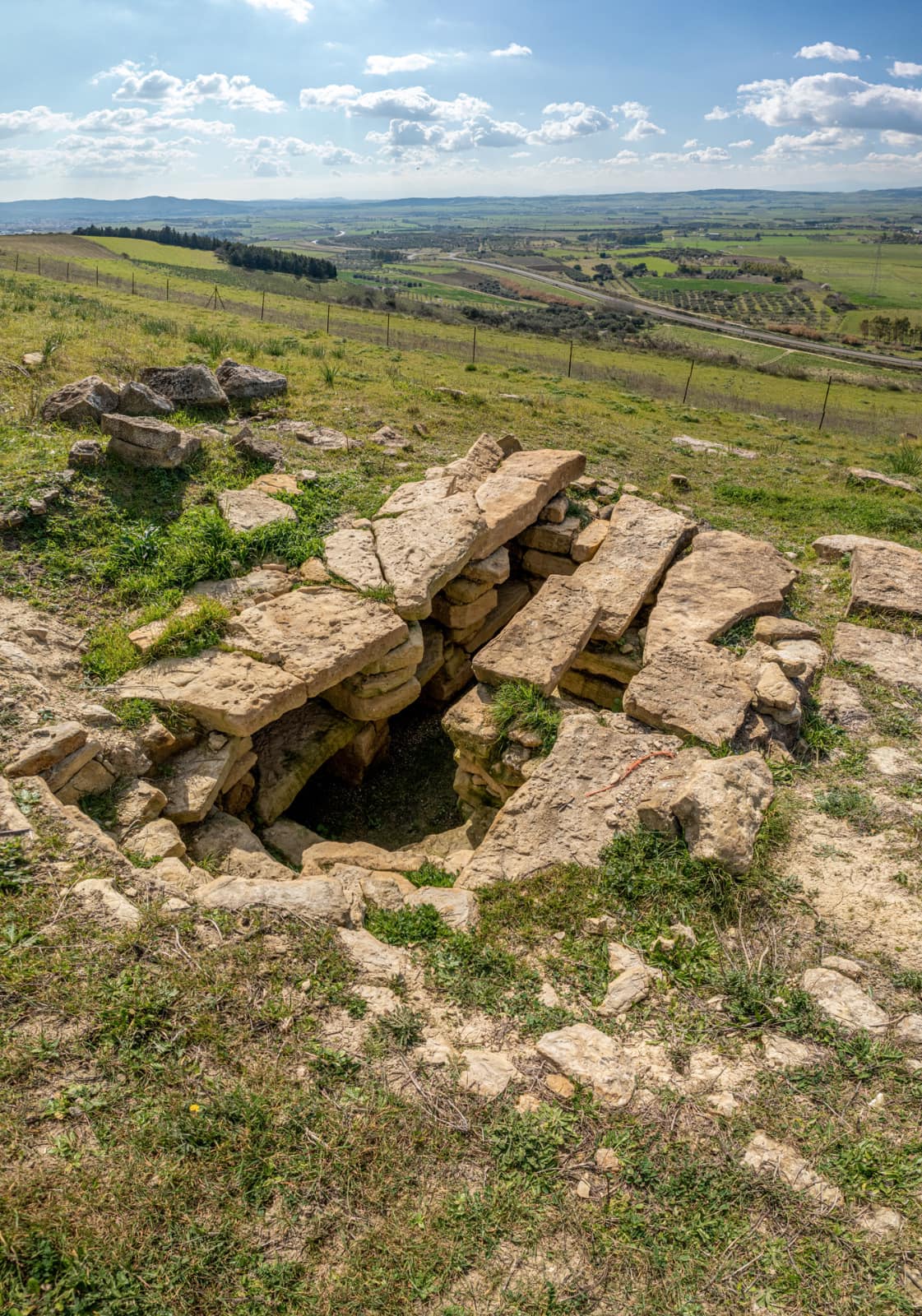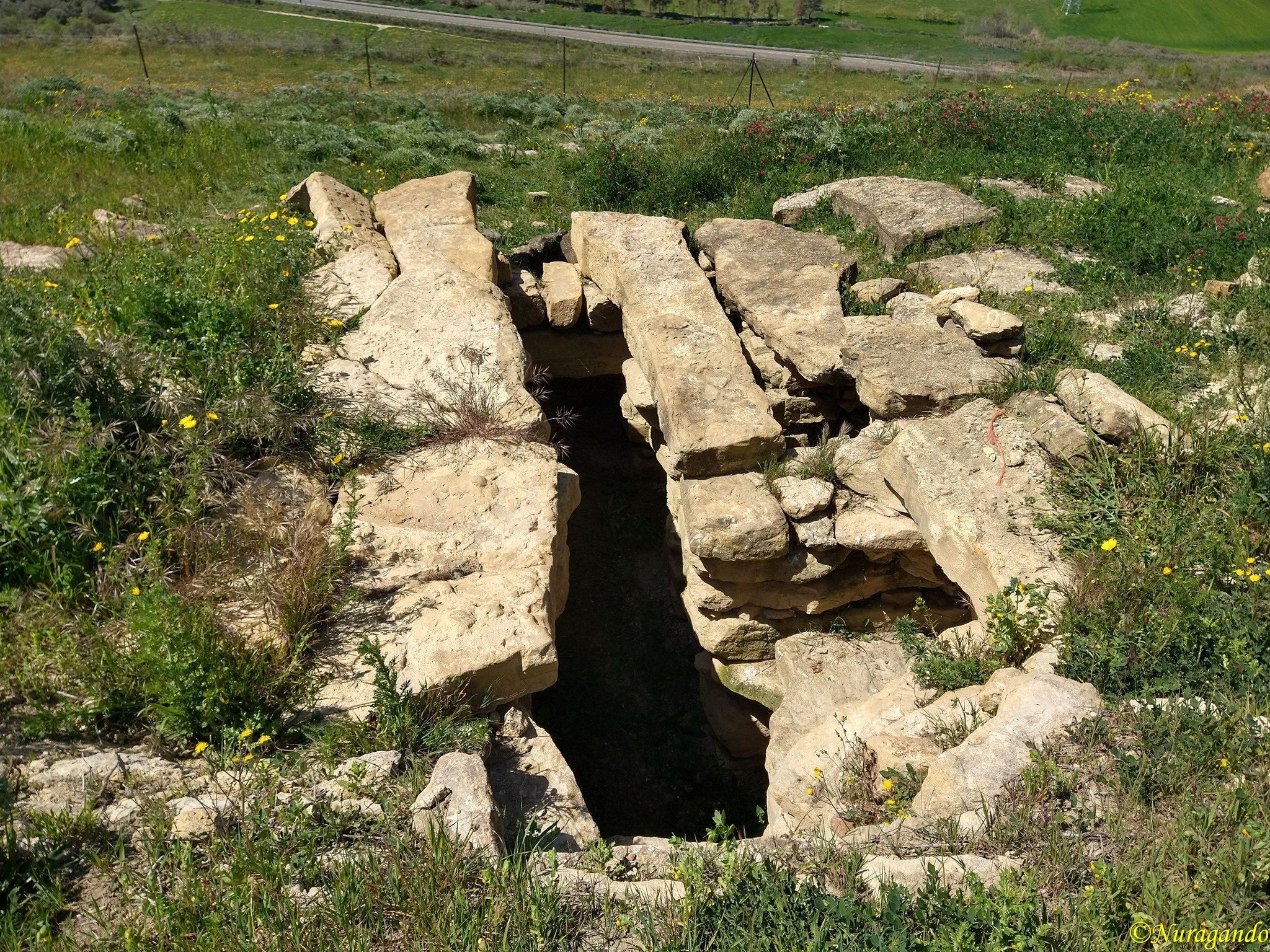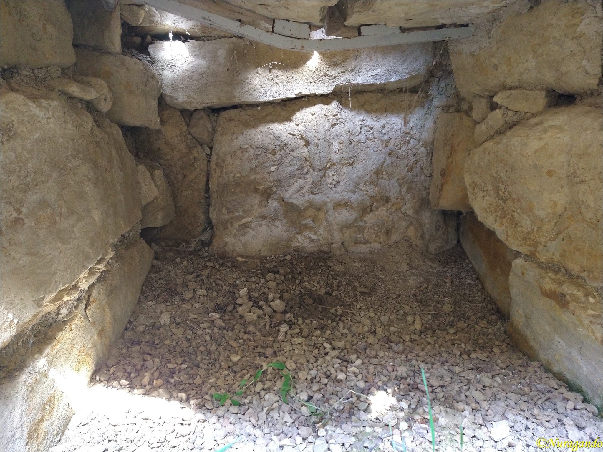 Che si tratti di un polilobato lo si vede da muri di collegamento che si diramano dalla torre centrale; ma la vegetazione e la terra rendono illeggibile la planimetria. E’ realizzato con enormi blocchi di marna. Sul lato ovest possiamo ammirare i filari perfettamente circolari, con blocchi lavorati e adattati proprio per ottenere queste curvature perfette.